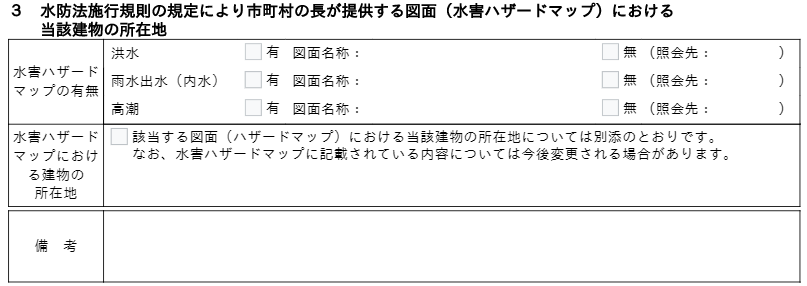重要事項説明ではこれらのマップの有無、対象不動産の所在地、指定避難所、問い合わせた先等を説明します。