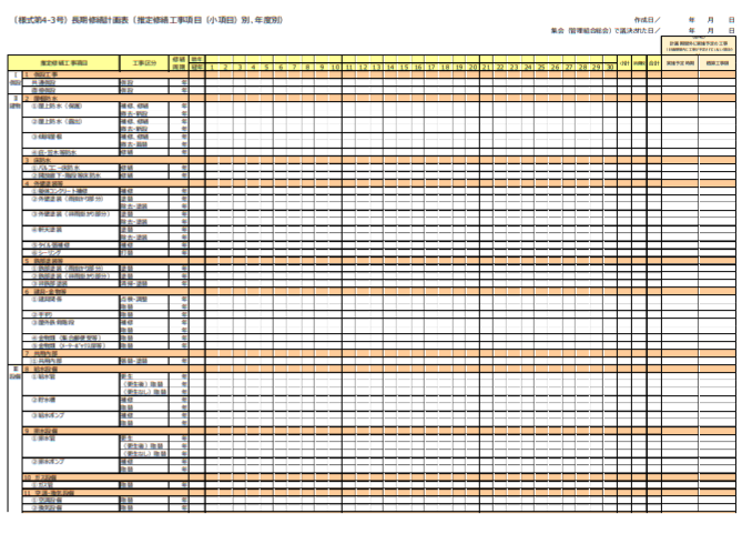 参考に、国土交通省が作成している長期修繕計画標準様式をご紹介いたします。主に分譲マンションの計画用に作成されたものです。