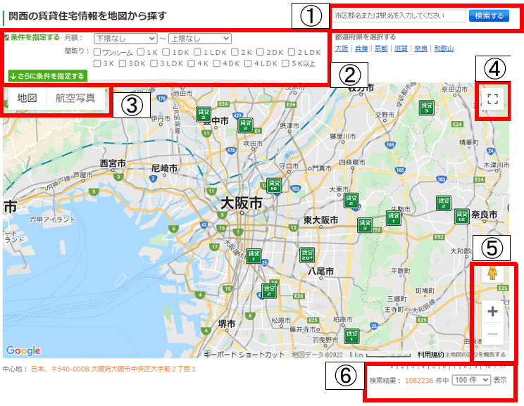 すると下のような画面になりますのでこちらの画面を基本に部屋探しをしていきます。使い方の説明をしていきます。