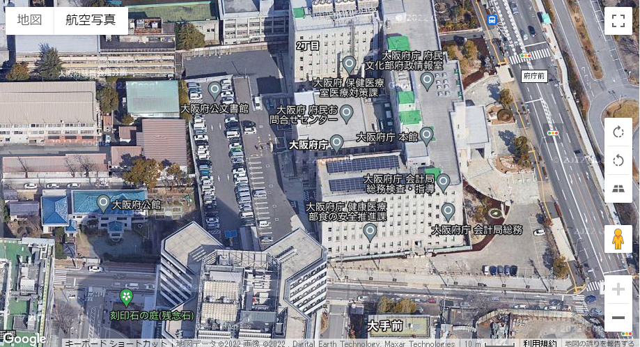 「地図」をクリックすると地形を見ることができます。マップでは確認しずらい地形の起伏が確認できます。「航空写真」をクリックすると上空からの画像を確認できます。