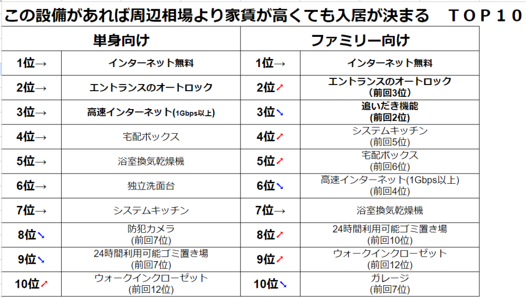 空室対策として最も効果的なのは、入居者が魅力を感じる設備を整えることです。2023年入居者に人気の設備ランキングでは、単身向け・ファミリー向けに集計がおこなわれ、ランキングにあるこれらの設備は入居者にとって利便性や安全性を高めるものであり、物件の魅力をアップさせる効果があります。特に、インターネット無料・高速インターネット回線は、現代の生活に欠かせないものとなっており、入居者にとっては必須条件となっています。