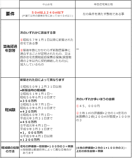 中古住宅について、以前「不動産取得税とは?」で書きました宅地等の軽減とは別に軽減措置が講じられています。軽減されるのは住宅については固定資産税評価額(課税標準)、土地については税額からです。要件がありますので注意が必要です。下記の表にまとめてありますのでご覧ください。