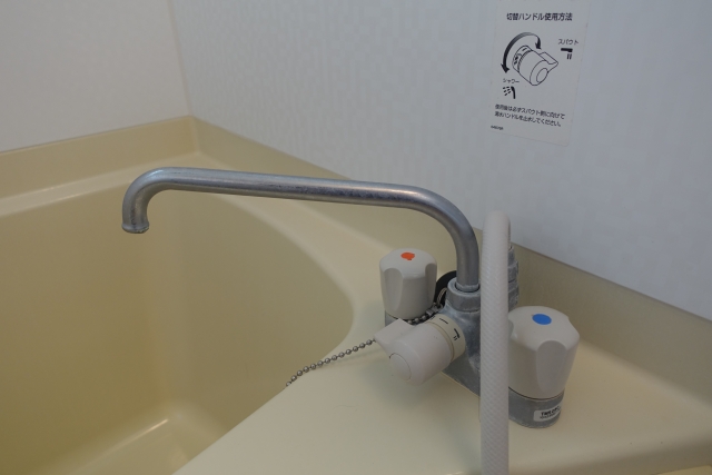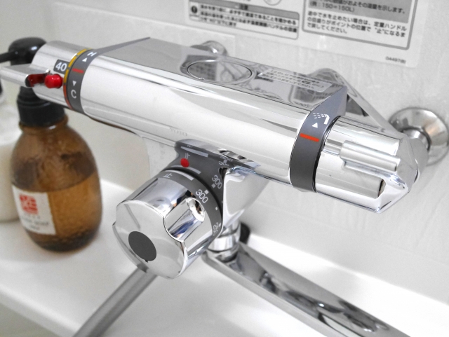写真はそもそもツーハンドル混合水栓とサーモスタット混合水栓の写真で機能が違いますが、ポイントは「ピカッと光って新しげ」です。