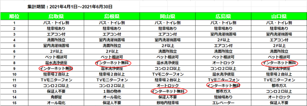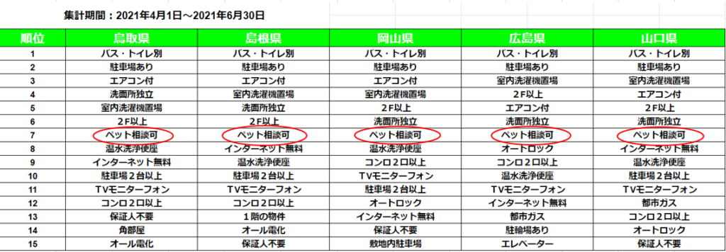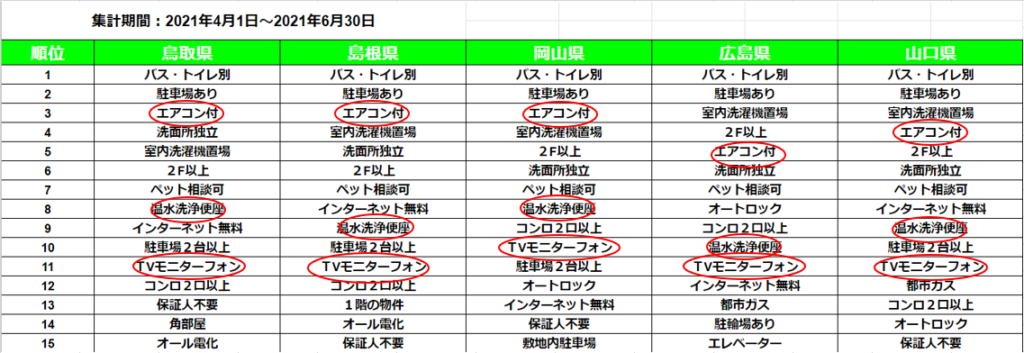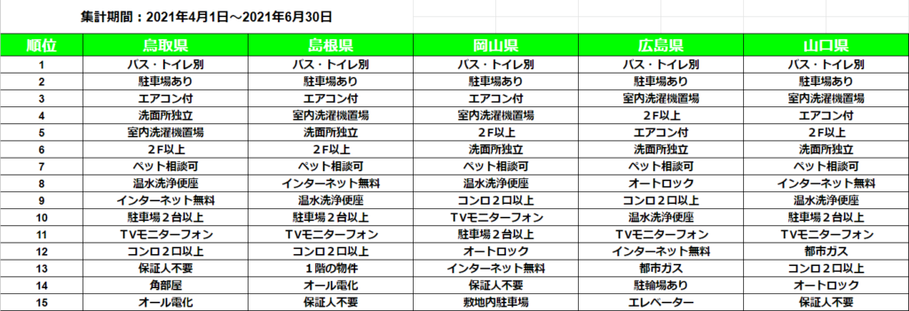 SUUMOが今年の4月1日から6月30日の間に選ばれた特徴項目のランキングを発表しました。今回は『中国地方版』ですが、中国地方は人口281万人の広島から、人口57万人の鳥取県があり、そういった地域性による違いも見れて参考になります。