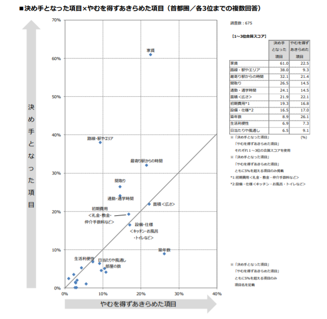 株式会社リクルート(SUUMO)が2018年度賃貸契約者動向調査のなかで首都圏における決め手となった項目とやむを得ずあきらめた項目を散布図に表しています。対象は首都圏ですが、家賃が重要であることは全国共通ではないでしょうか。